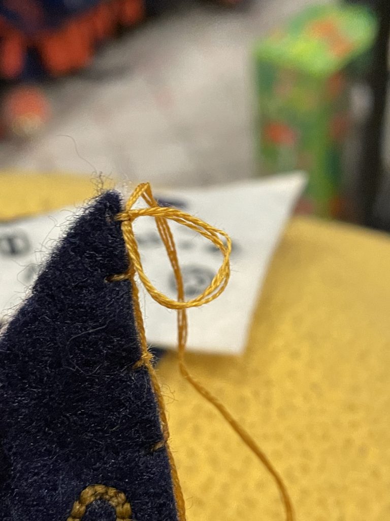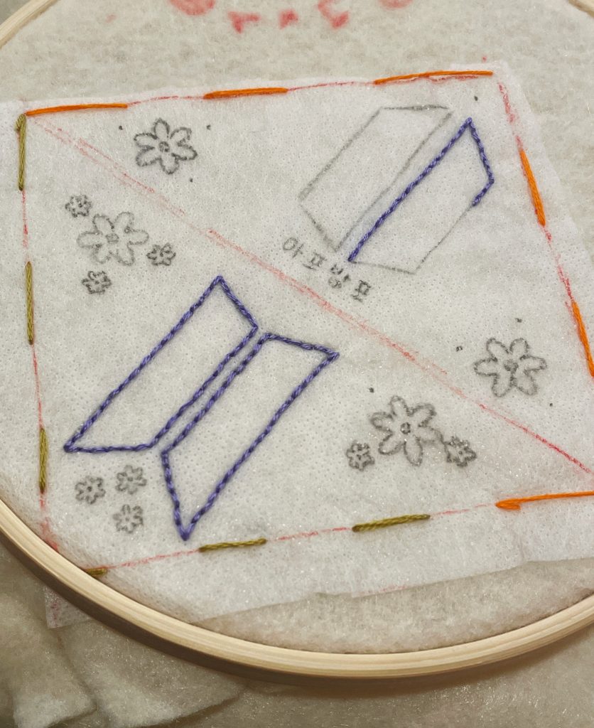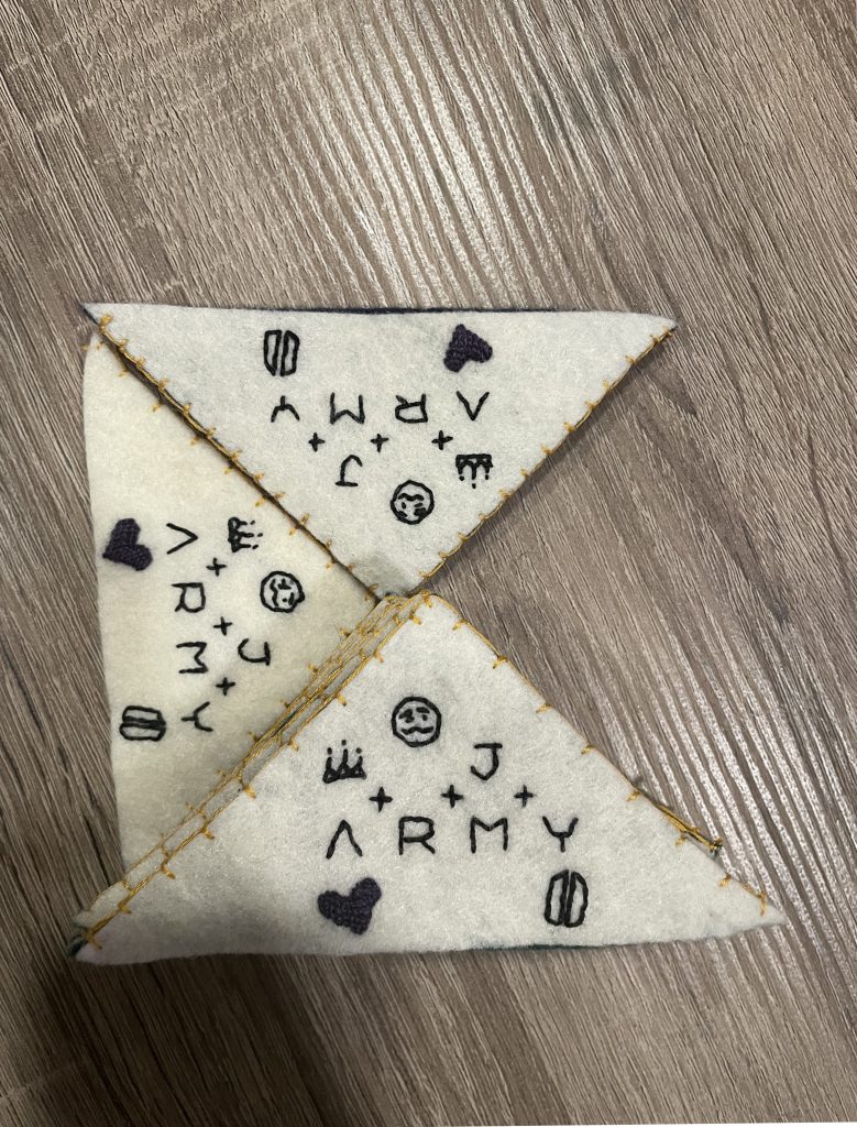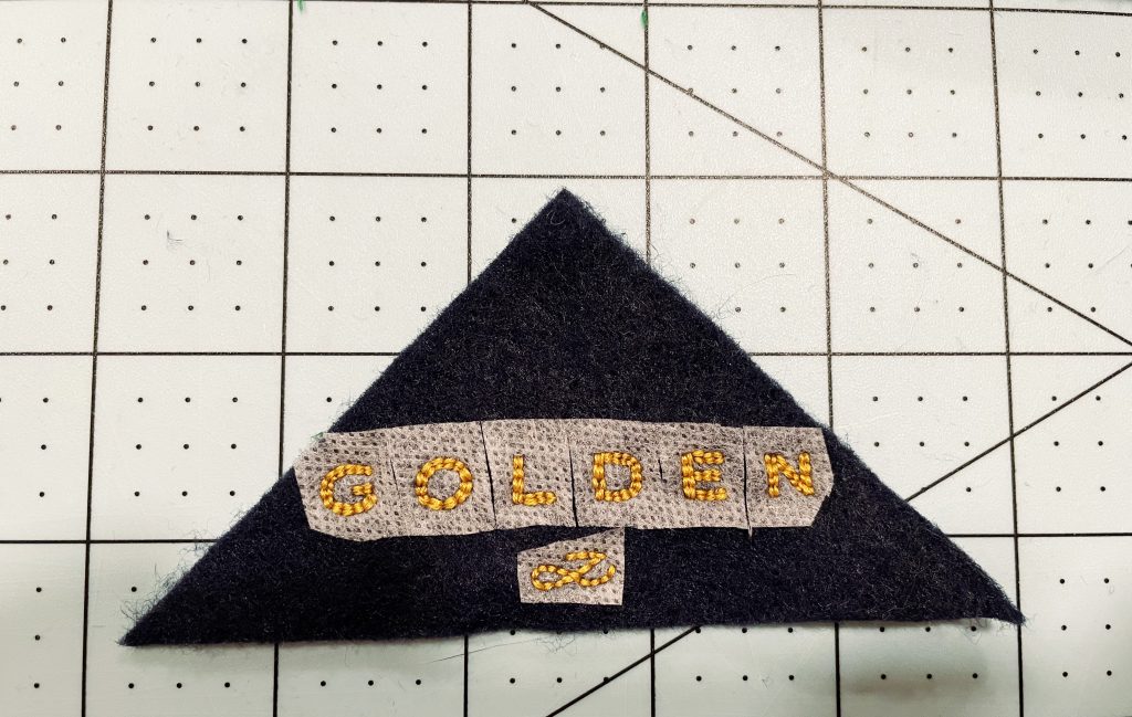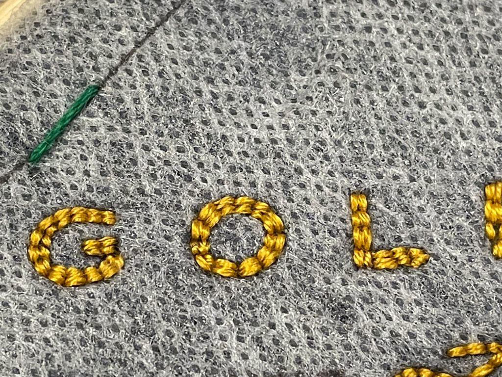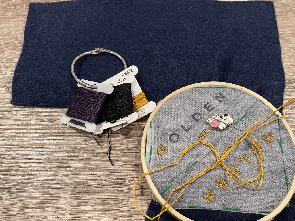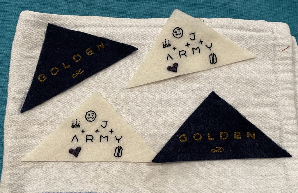 Three of my embroidered Golden bookmark in colors that match the album's versions: white, navy blue and hunter green.