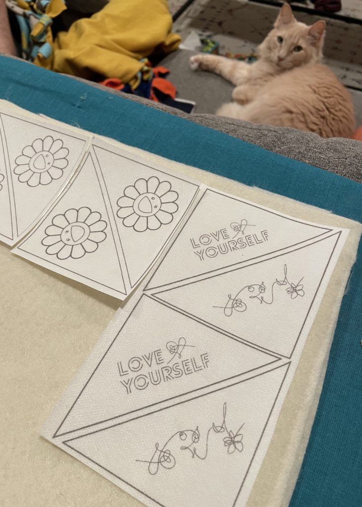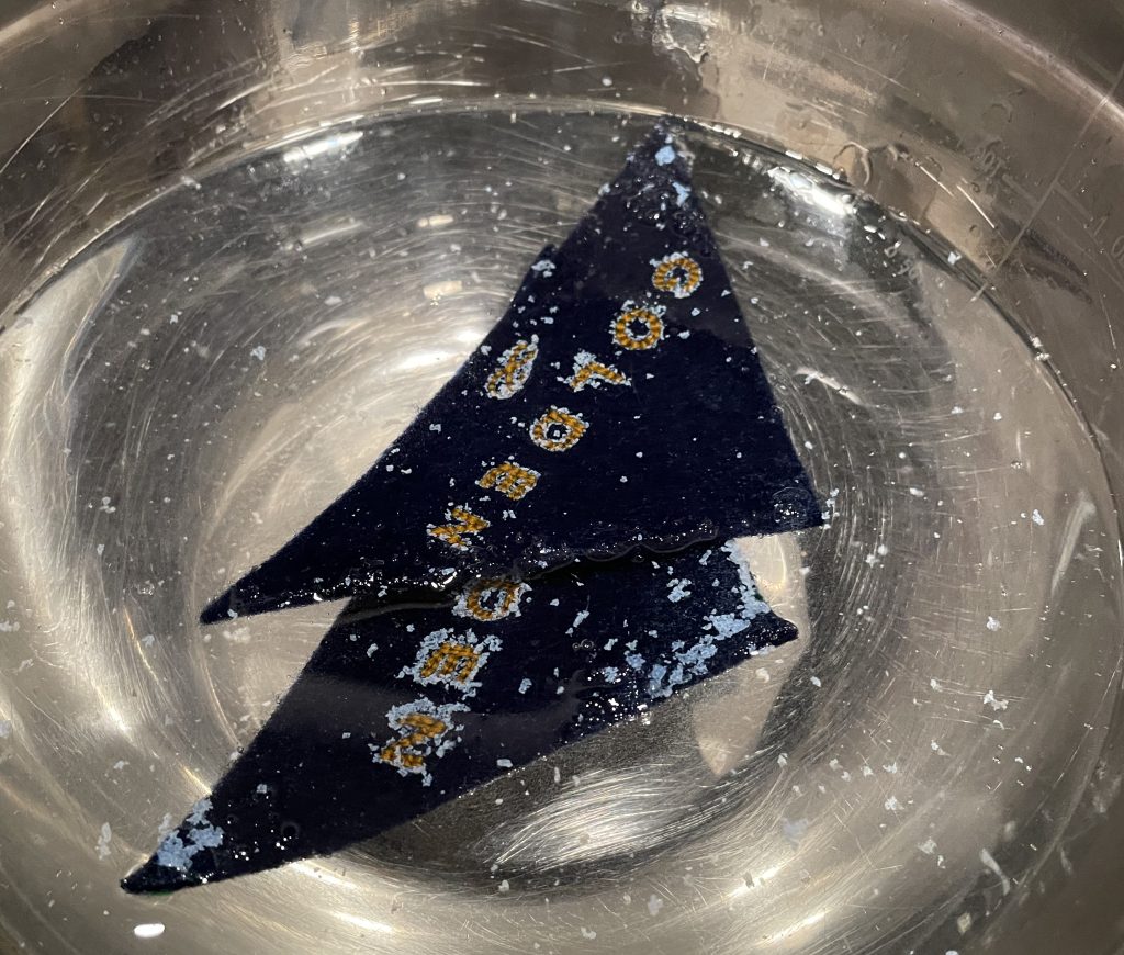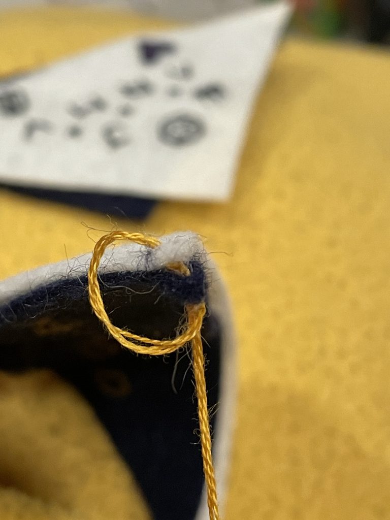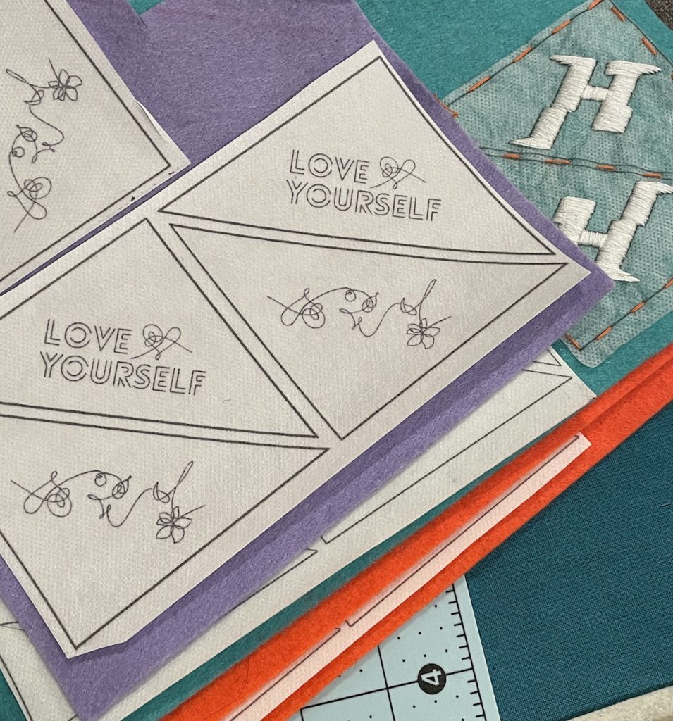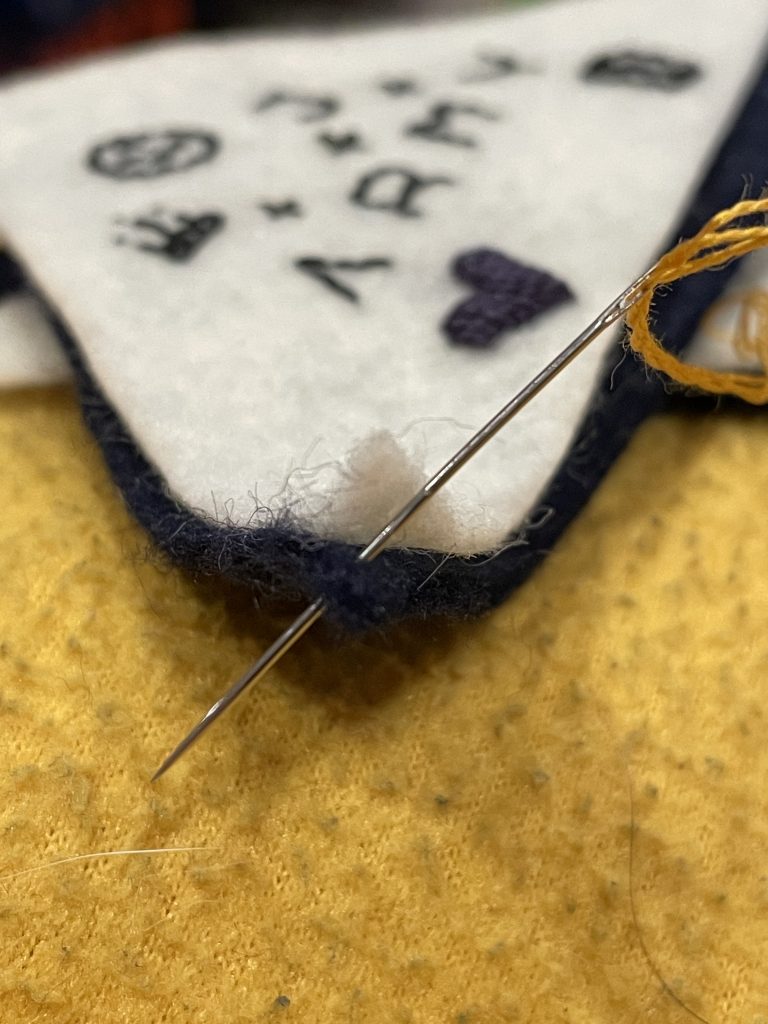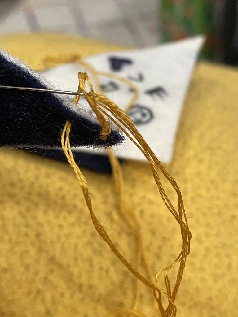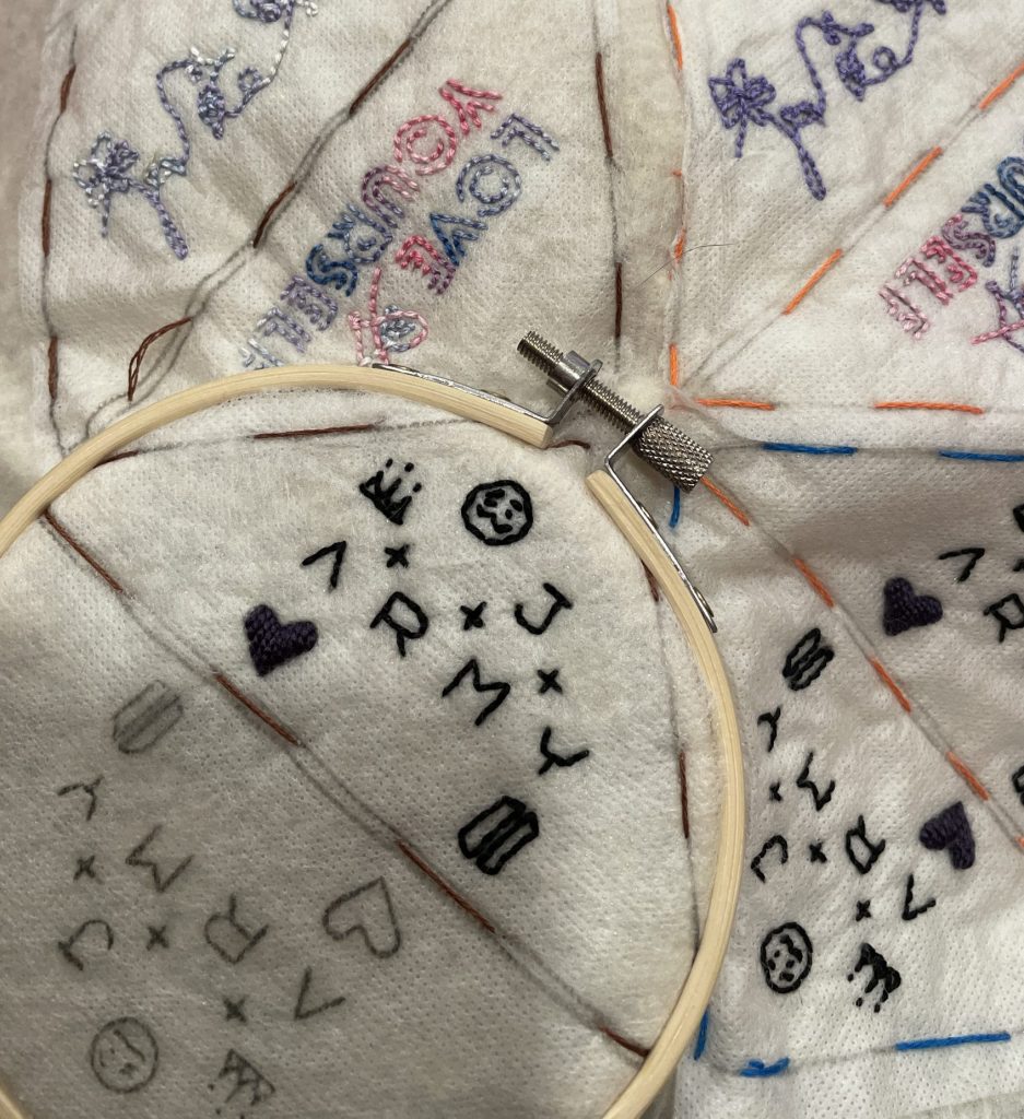 Three of my embroidered Golden bookmark in colors that match the album's versions: white, navy blue and hunter green.
